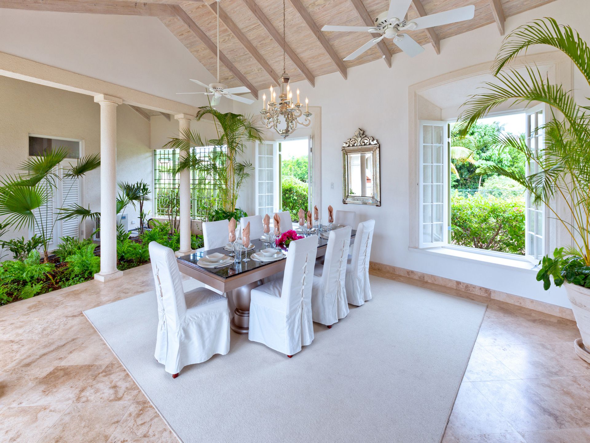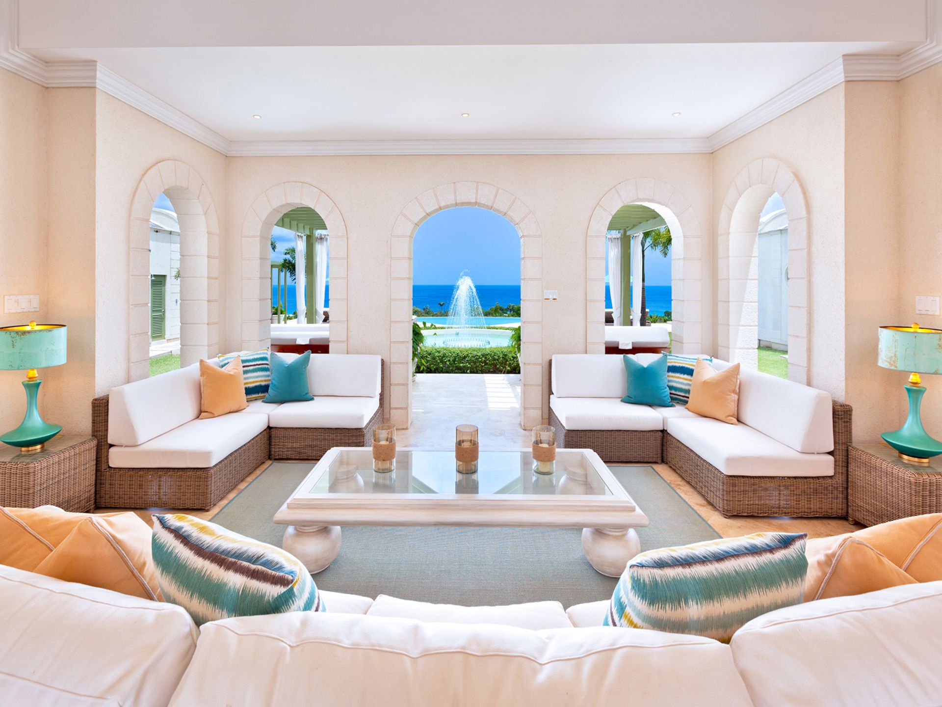 At the heart of the home is an open-air living room that flows effortlessly to the gardens, a tranquil fountain, an expansive infinity-edge swimming pool, and the turquoise sea beyond. The central courtyard layout provides both privacy and connectivity, ideal for both intimate living and entertaining.