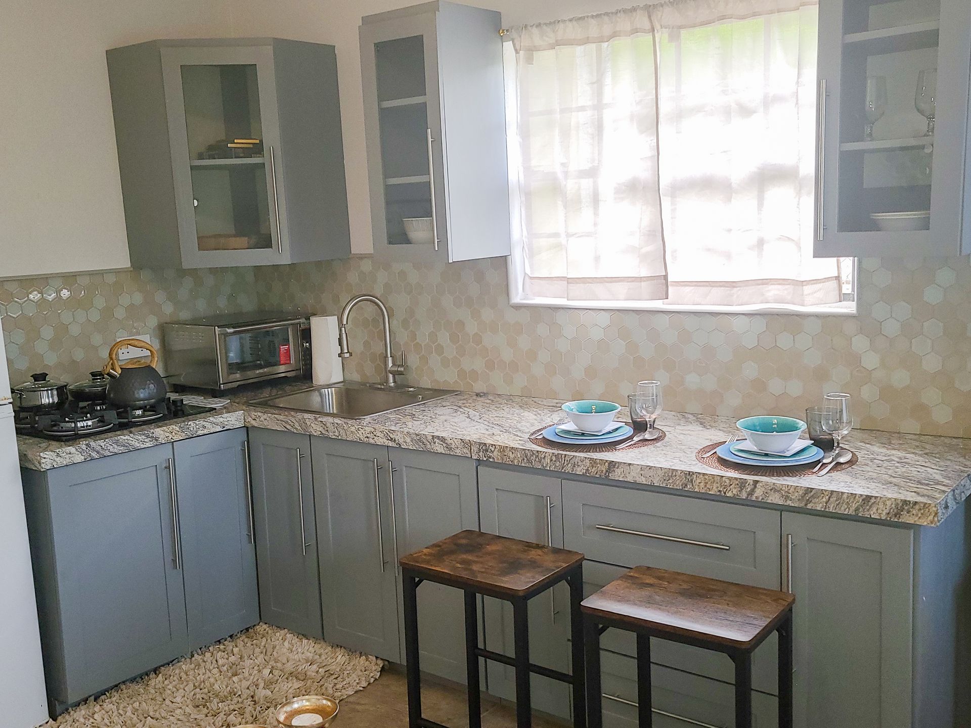 The state-of-the-art kitchen is a neat masterpiece, with a really nice layout that maximises space, and a pull-out dining nook that folds back to create more counter space when needed.