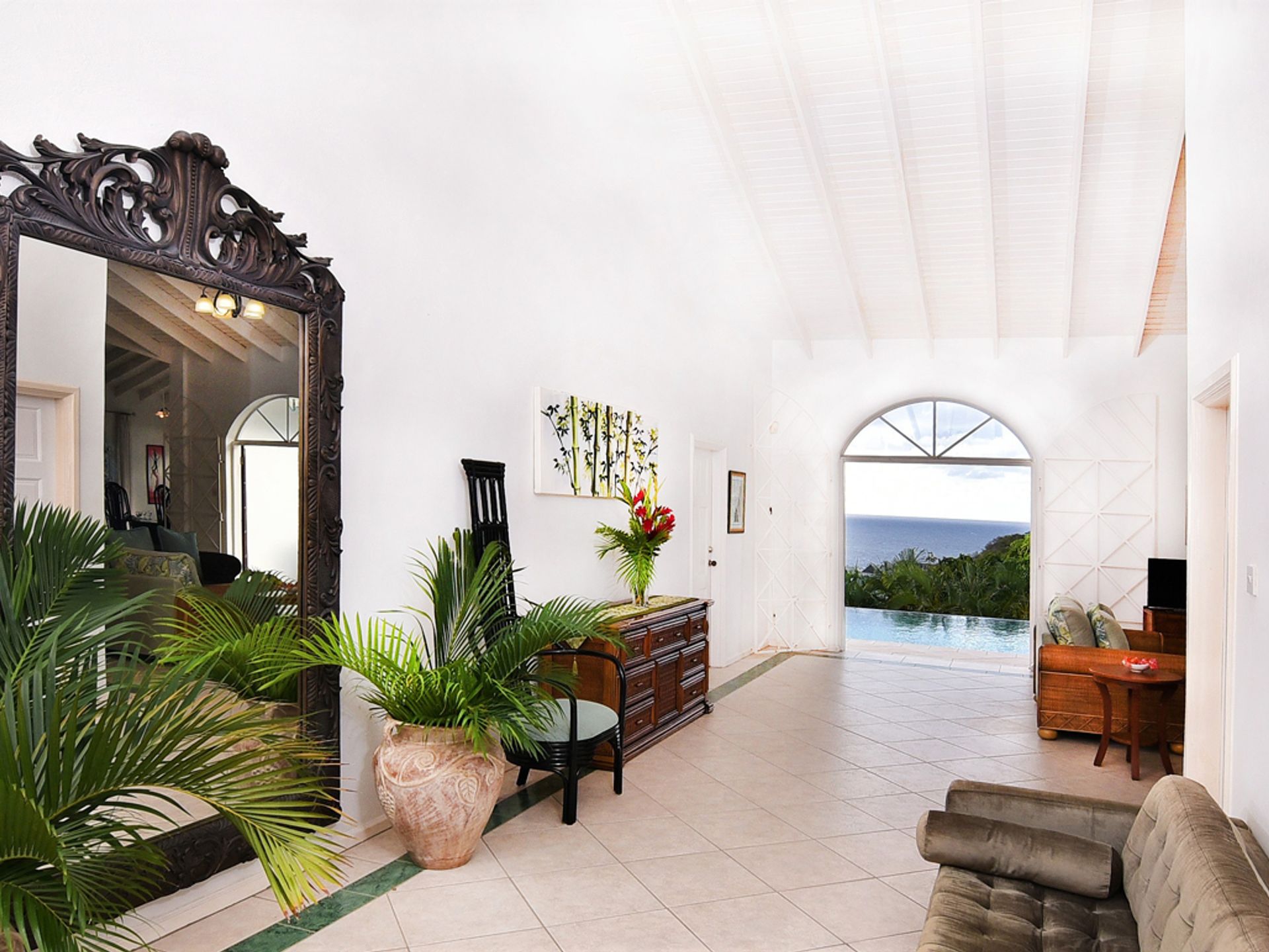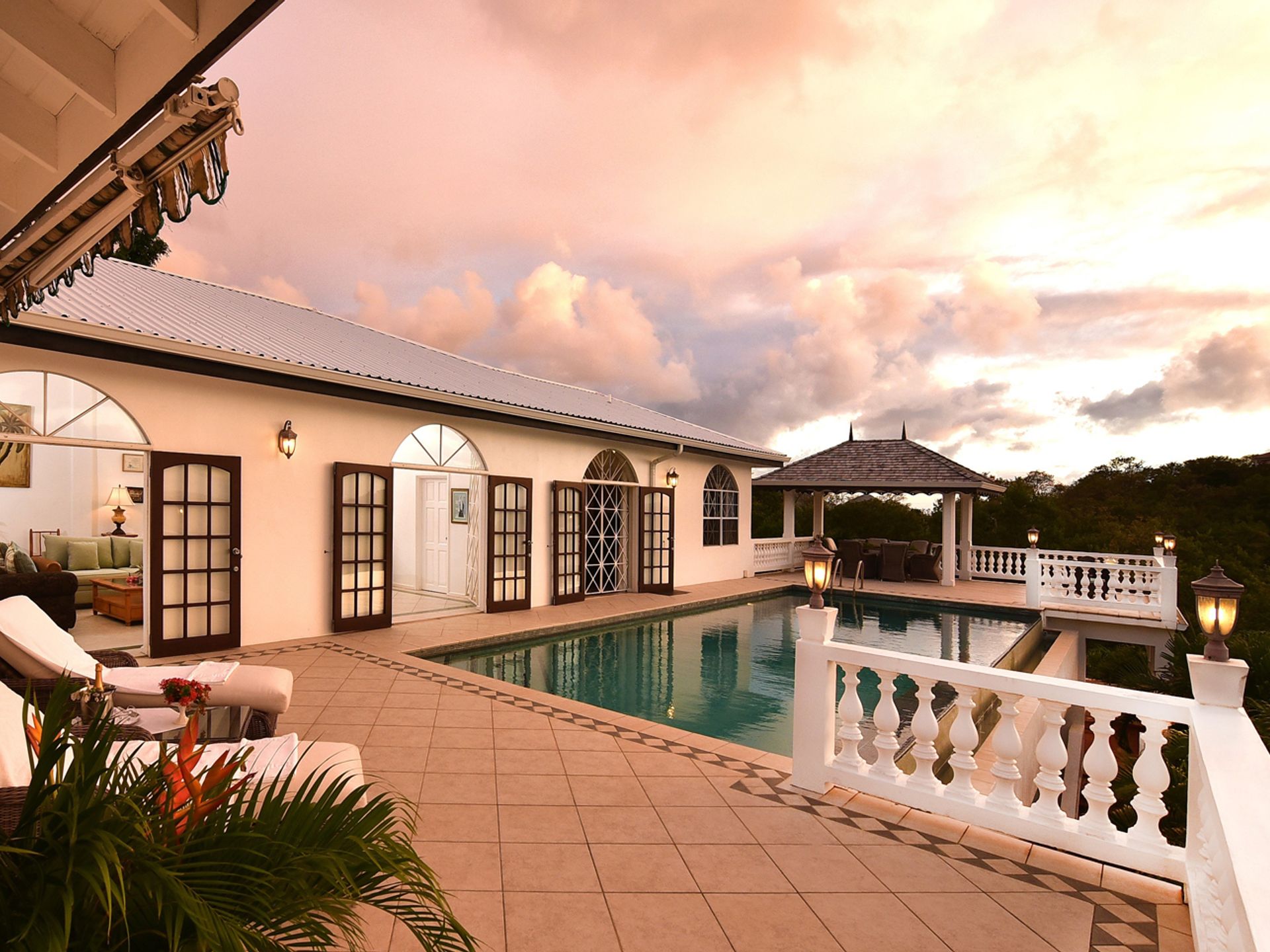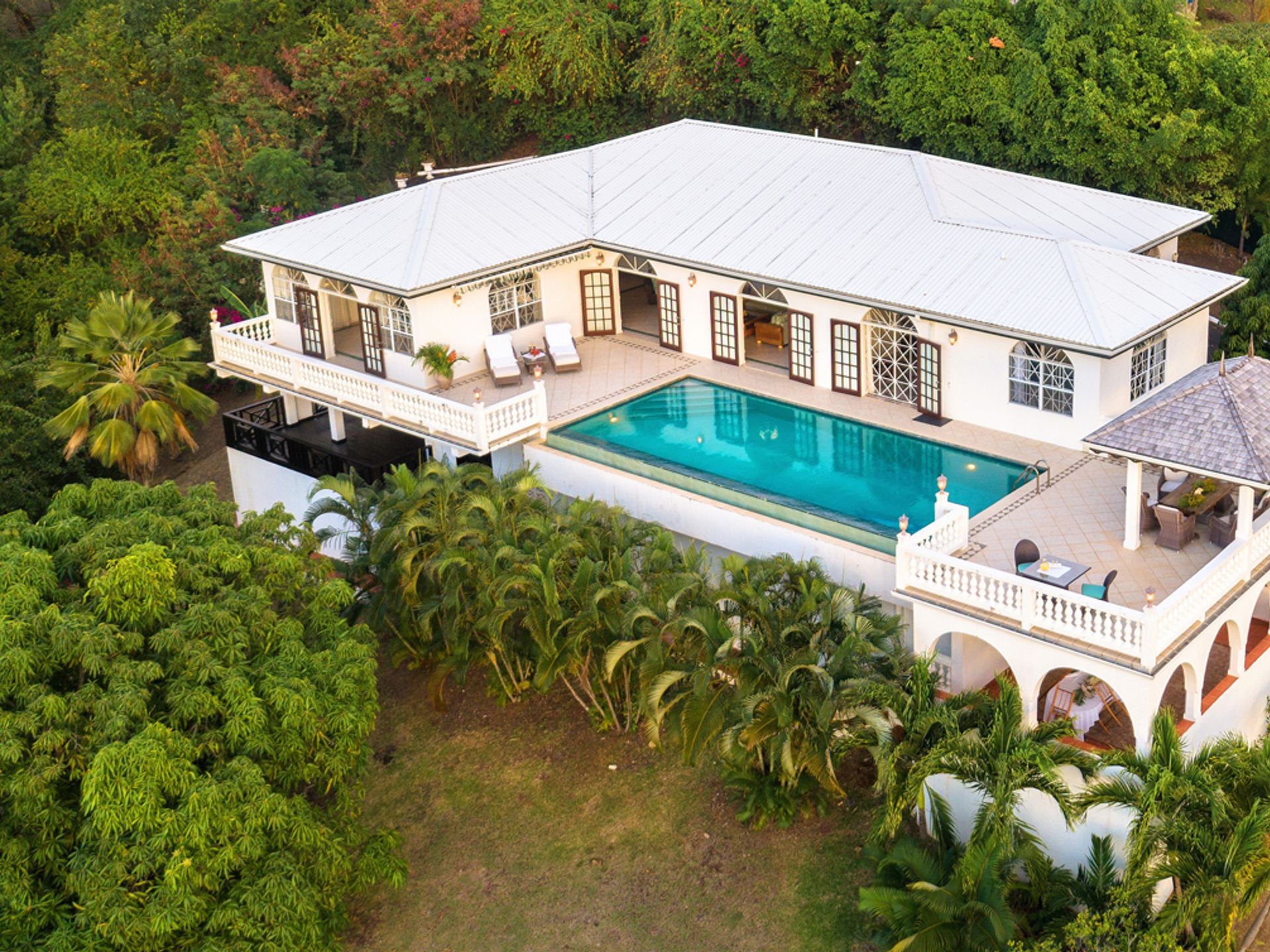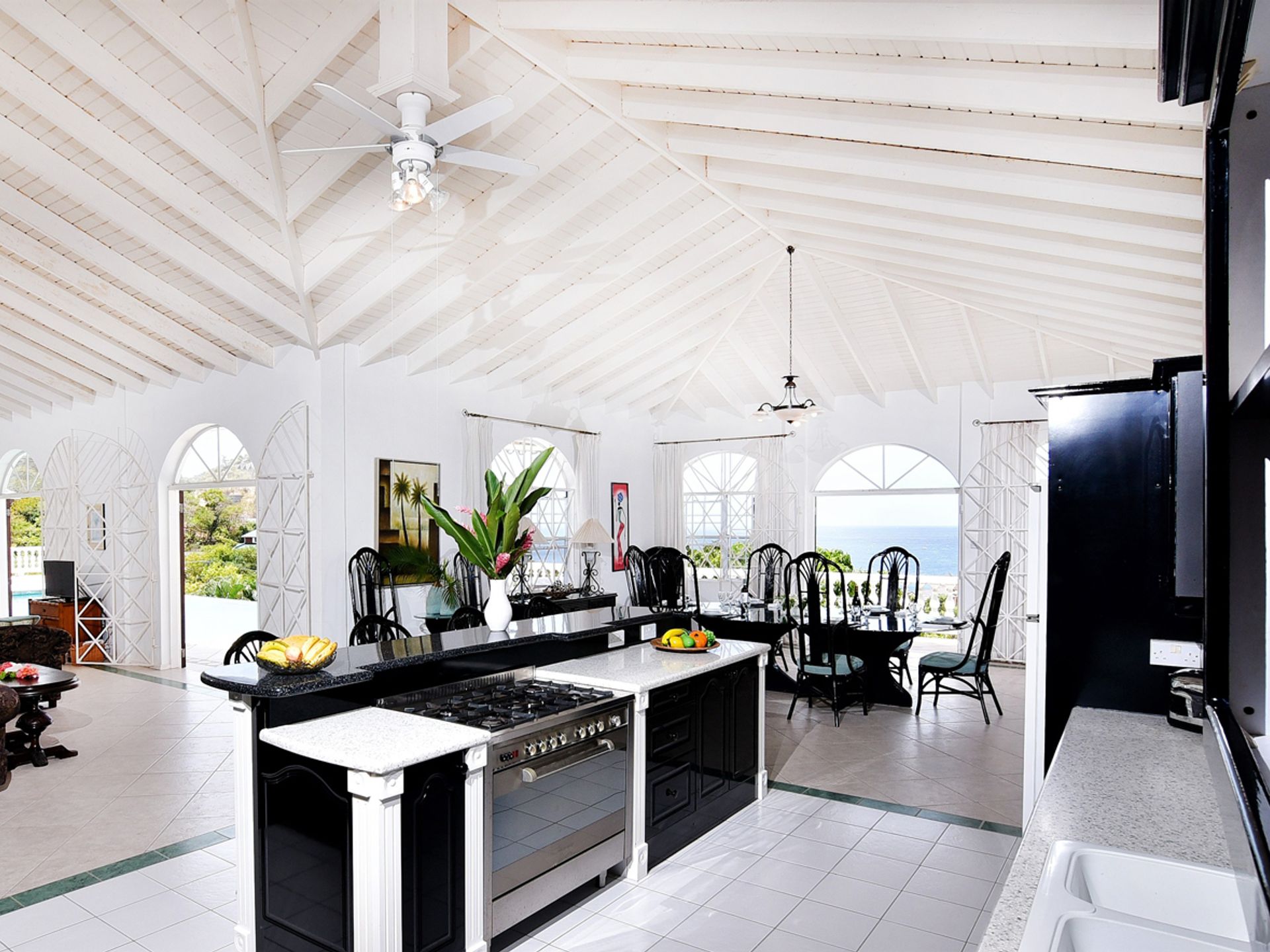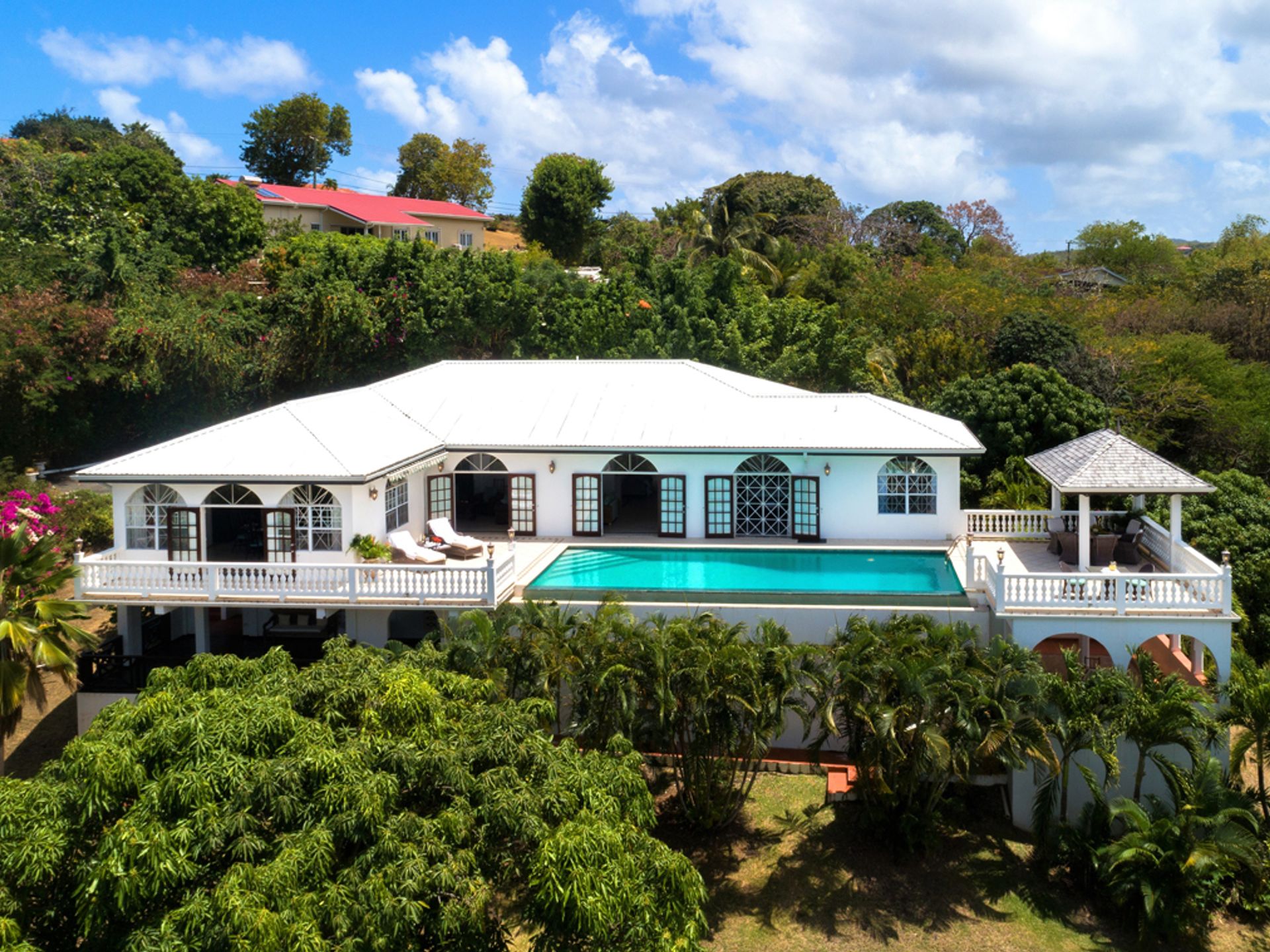 The house is constructed with an L-shape and high ceilings to take full advantage of its elevated position. As one might expect, cooling sea breezes are constant throughout the airy home. The open plan living space features a chef's kitchen (equipped with quality modern appliances). The kitchen extends to the bright dining area, then onto a spacious living room, which accesses the patio through large arched glass panel doors. The adjoining pool deck, large private pool and gazebo are ideal for entertaining.