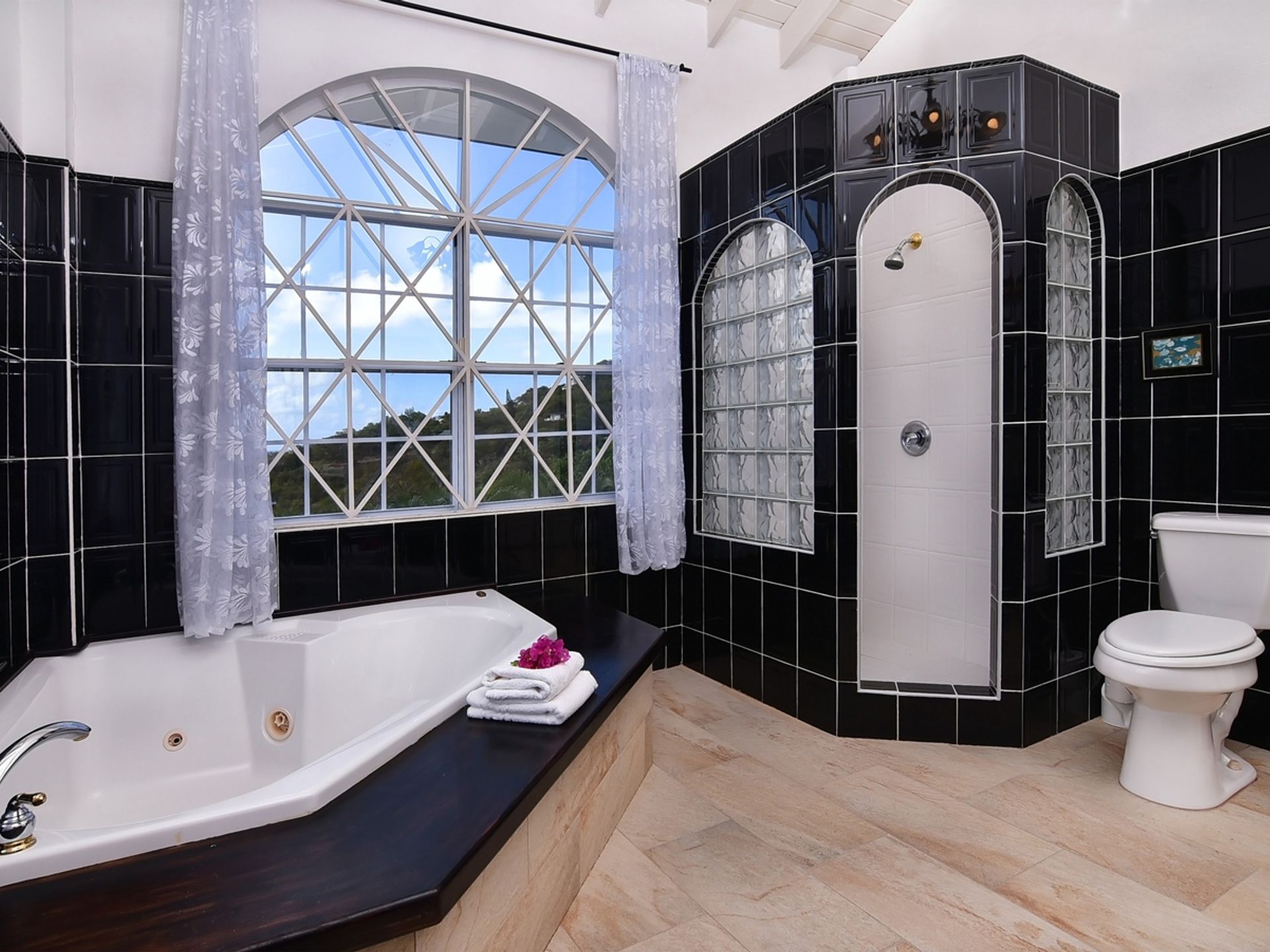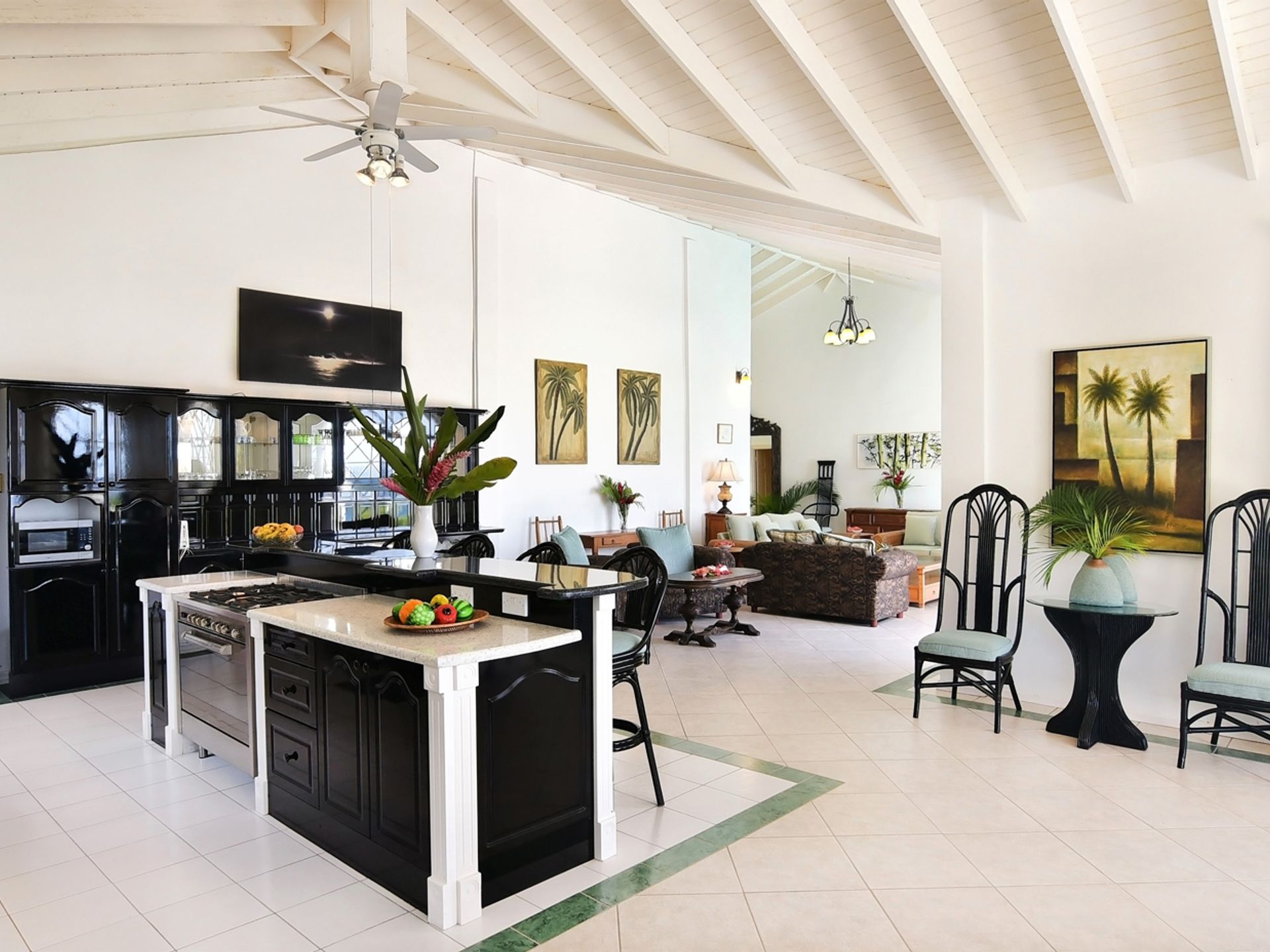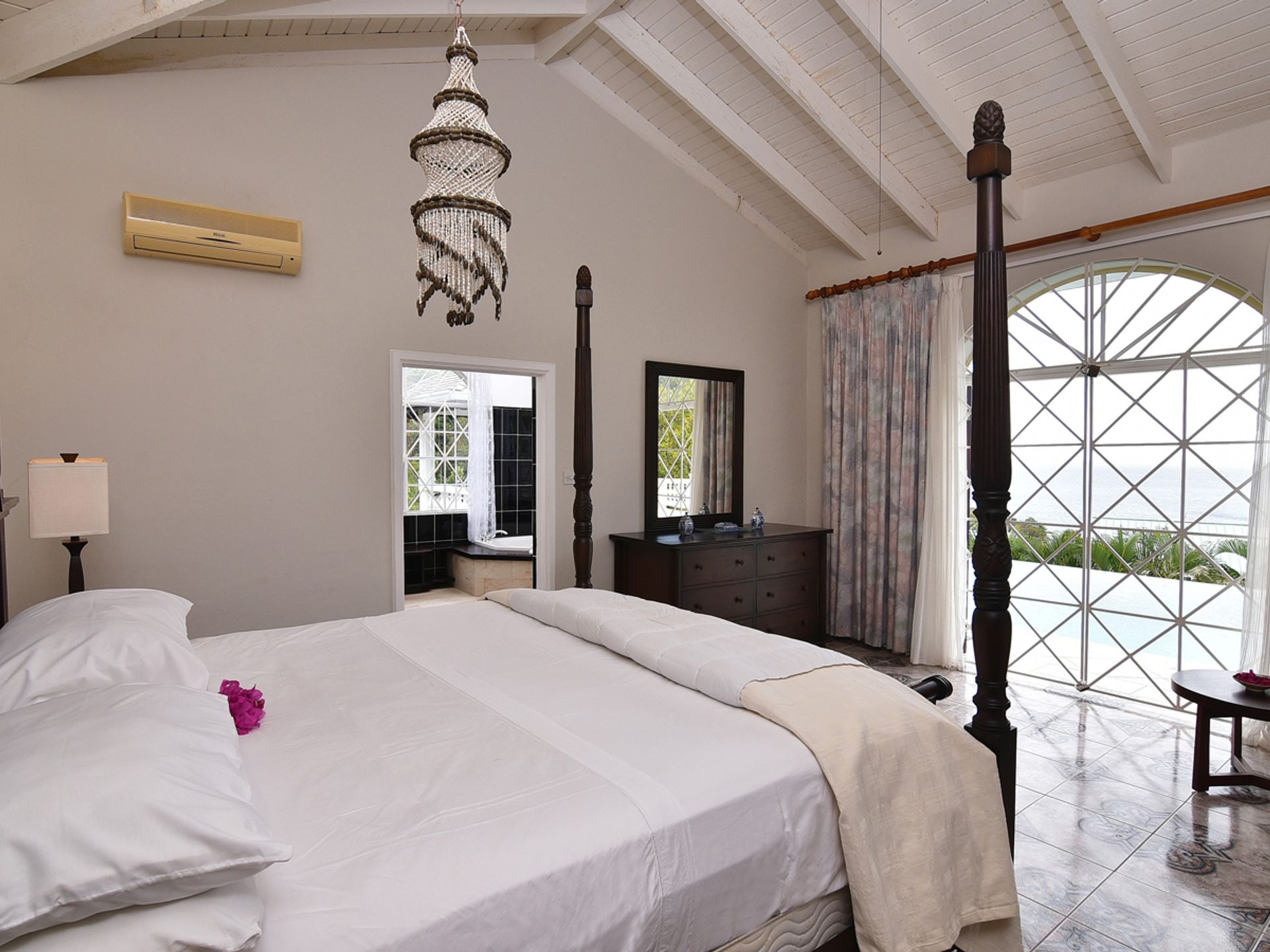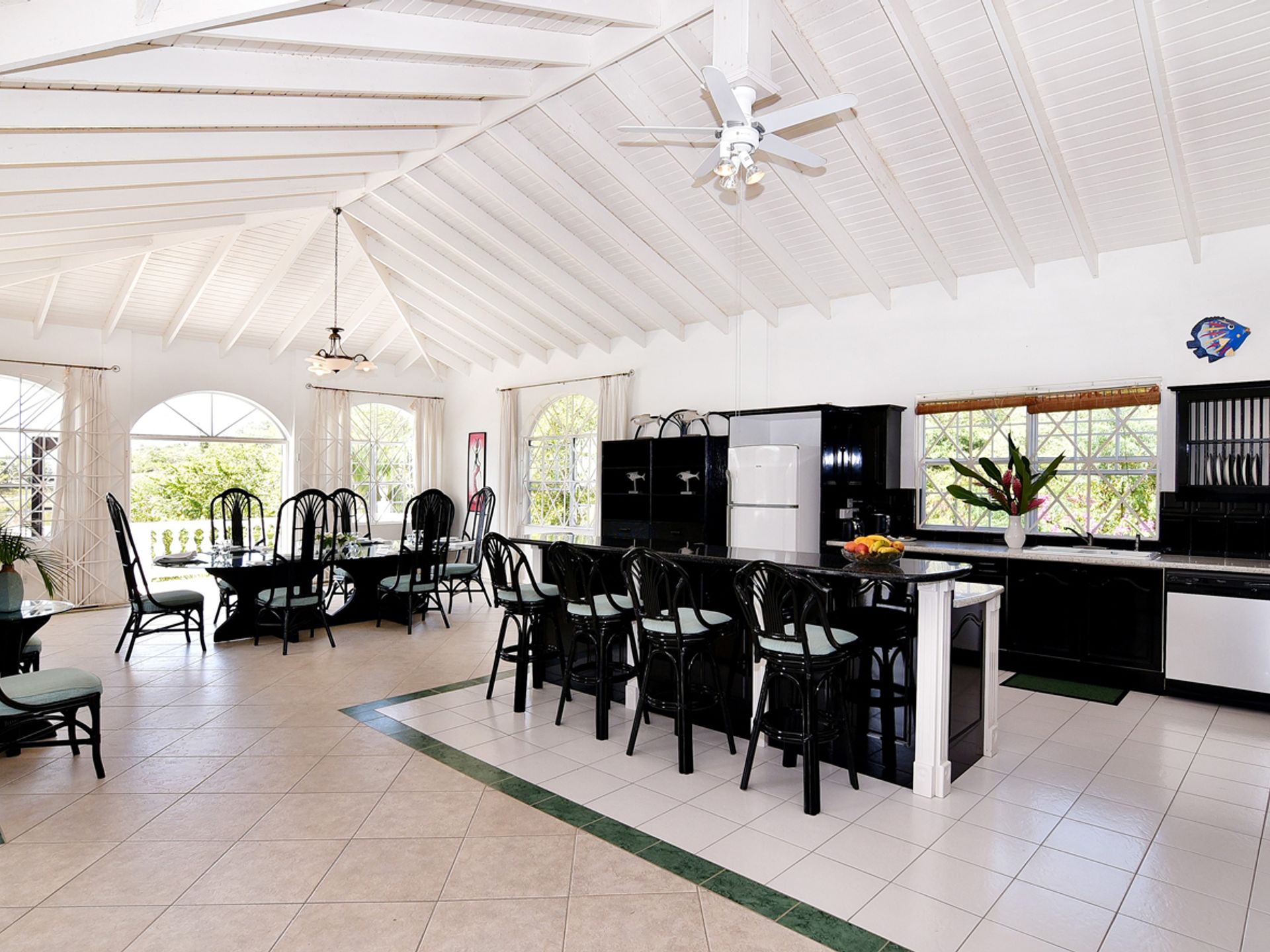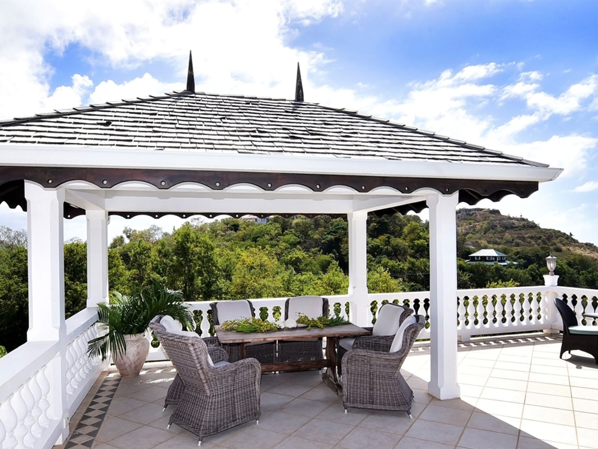 The house is constructed with an L-shape and high ceilings to take full advantage of its elevated position. As one might expect, cooling sea breezes are constant throughout the airy home. The open plan living space features a chef's kitchen (equipped with quality modern appliances). The kitchen extends to the bright dining area, then onto a spacious living room, which accesses the patio through large arched glass panel doors. The adjoining pool deck, large private pool and gazebo are ideal for entertaining.