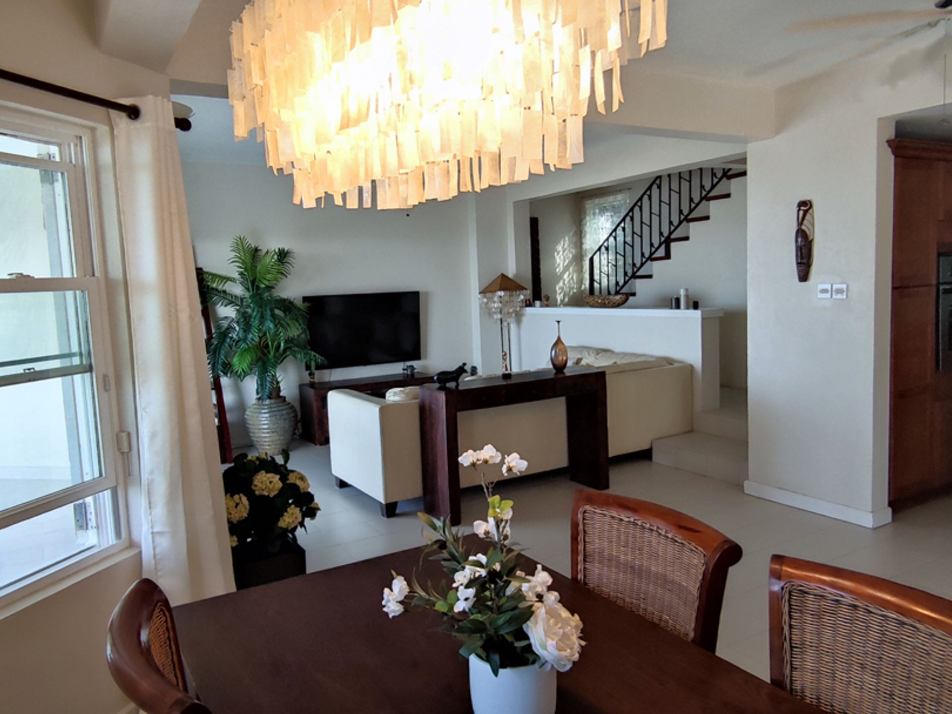 This home welcomes you through a well-appointed foyer. Upon entry stationed to the right is a large utility room equipped with a washer and dryer. Villa Rodney is tastefully furnished and fully equipped with the finest quality finishes. The open-concept living, dining, and kitchen areas reflect simplicity and elegance. Directly off the living room, to the left, is the grand balcony with dark rattan and glass table set for al fresco dining and seating for six people. On an elevated level to the right is a storage room below the staircase.
