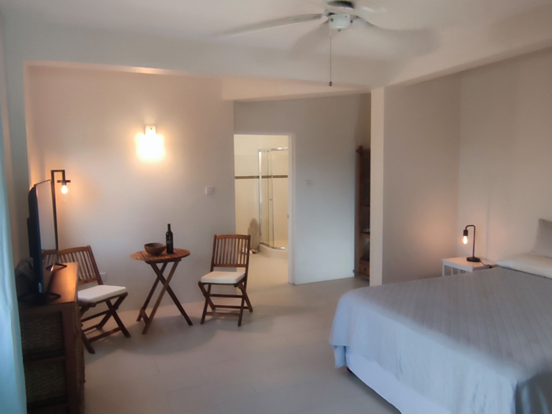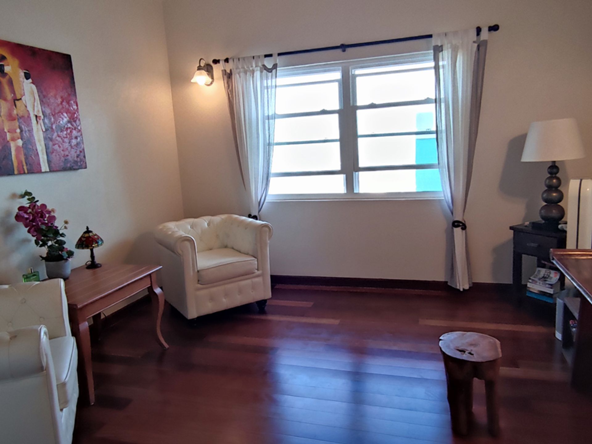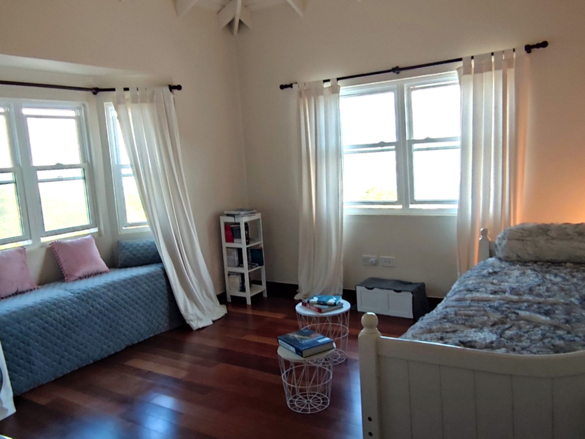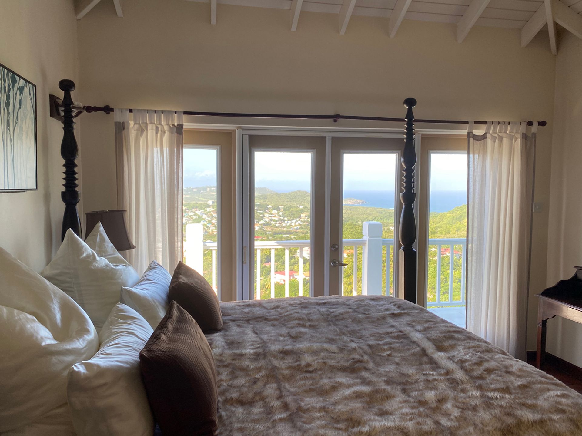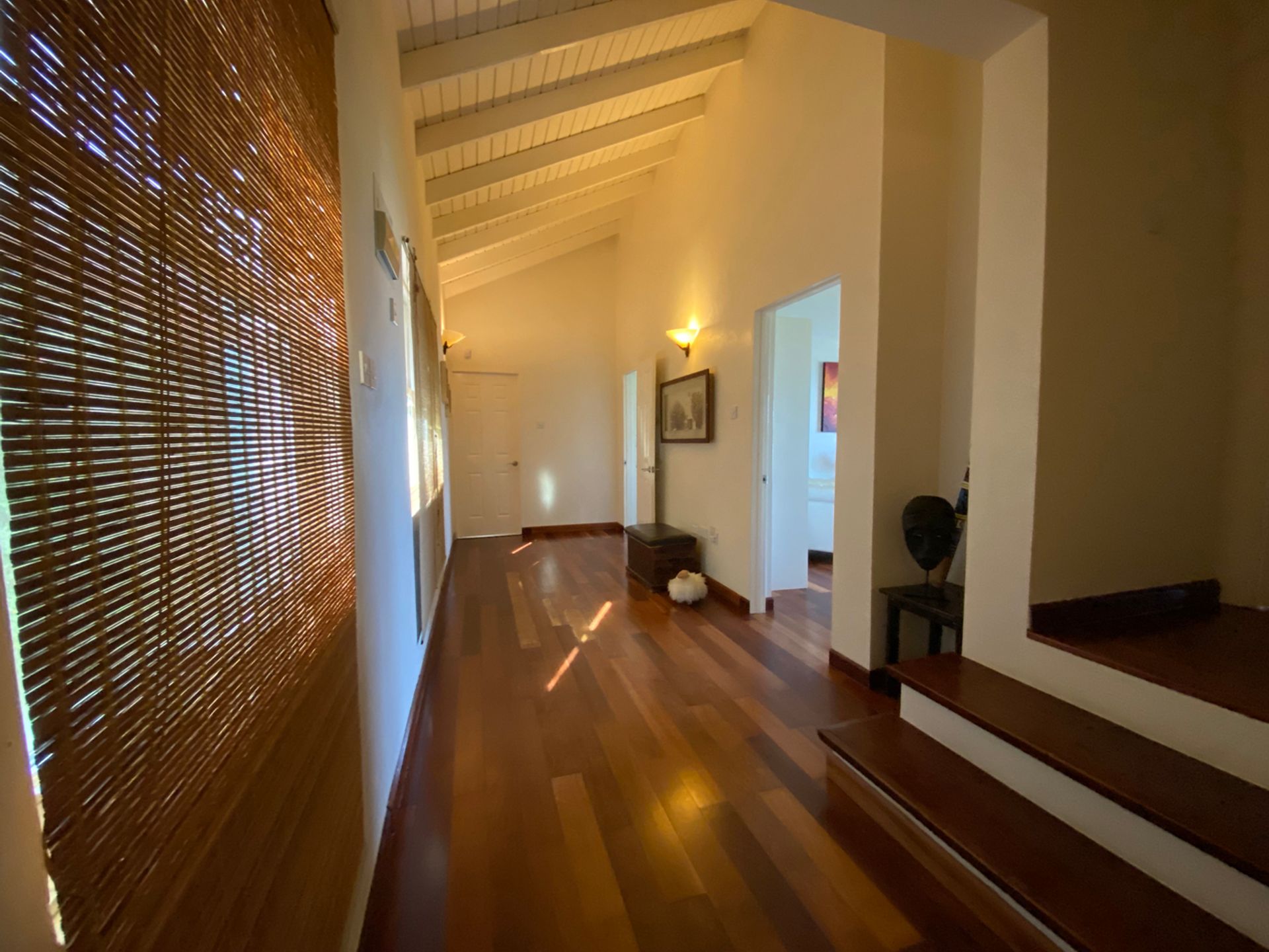 A stunning wooden staircase leads upstairs to the three main bedrooms; a master bedroom with an en-suite bath and a balcony that has a panoramic view followed by two elegant bedrooms which are used right now as a study and a library, and share one full bath. The rooms have been tastefully done with imported Brazilian wooden floors, complimented by wooden side tables with bed lamps. All bedrooms are air-conditioned with ceiling fans which is just the icing on the cake as the entire villa receives a constant refreshing Atlantic breeze ensuring all rooms remain cool throughout the day.
