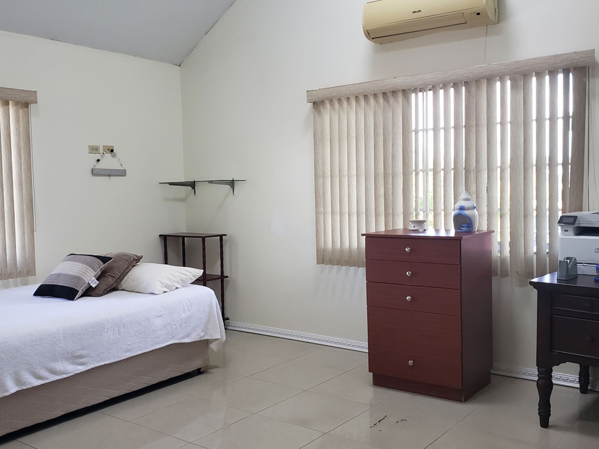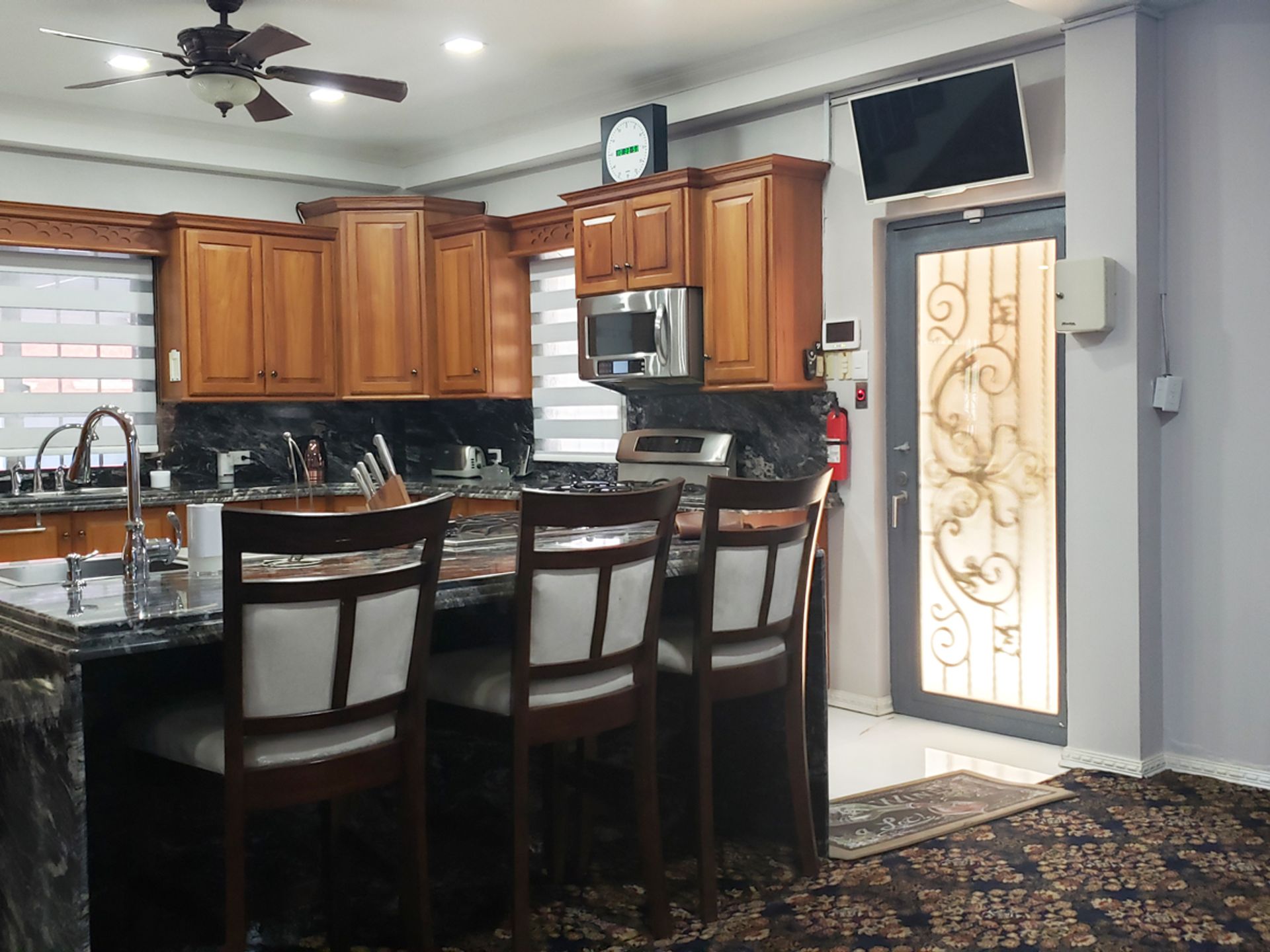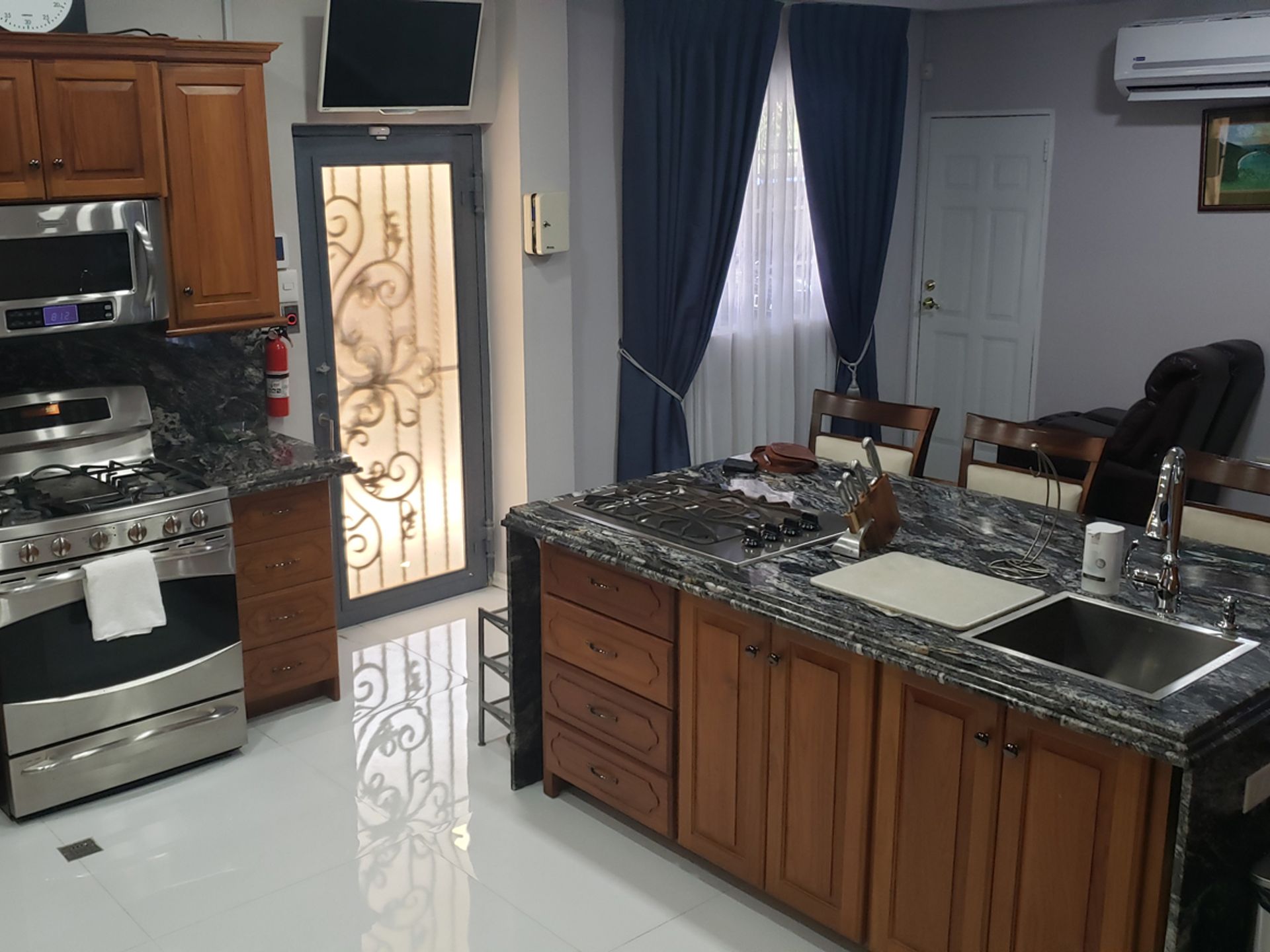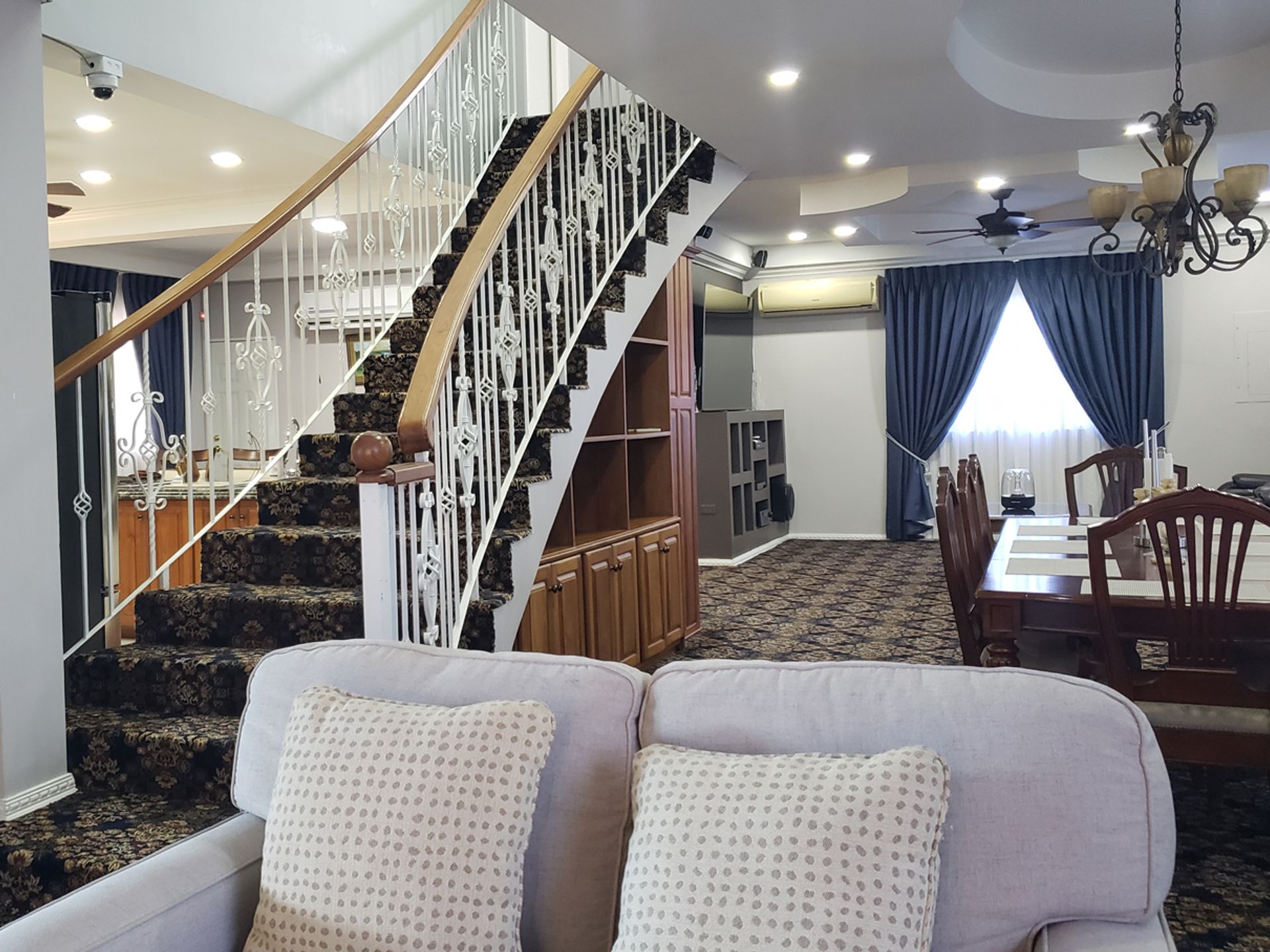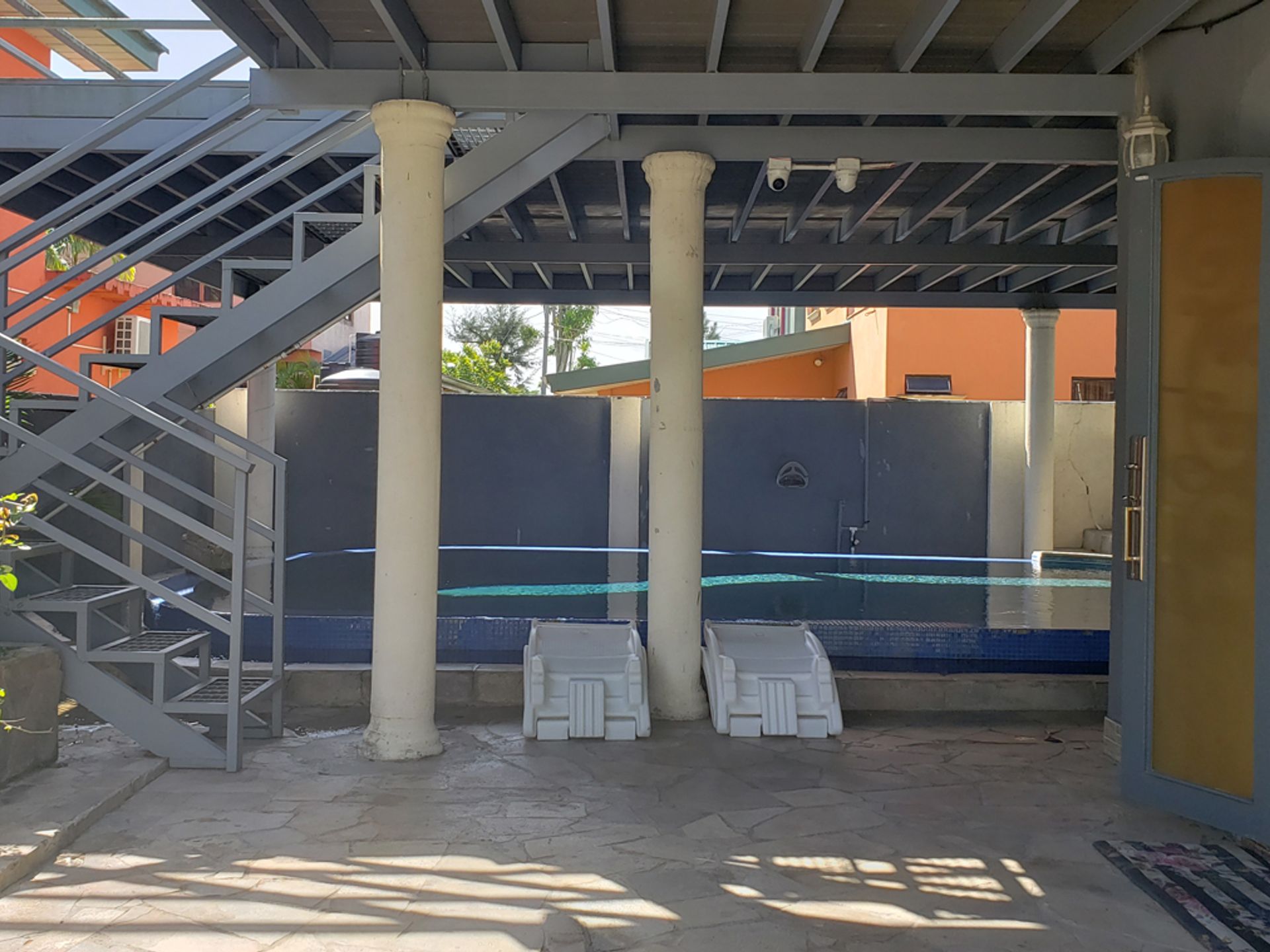 Renovated in 2019 and fully air-conditioned, this move-in ready two-storey home features an open-concept ground floor with living, dining, and family/TV areas, a modern kitchen with teak cabinetry and granite countertops, a breakfast nook, full bathroom, and enclosed laundry. Glass doors lead from the living area to the poolside, creating ideal indoor-outdoor flow.