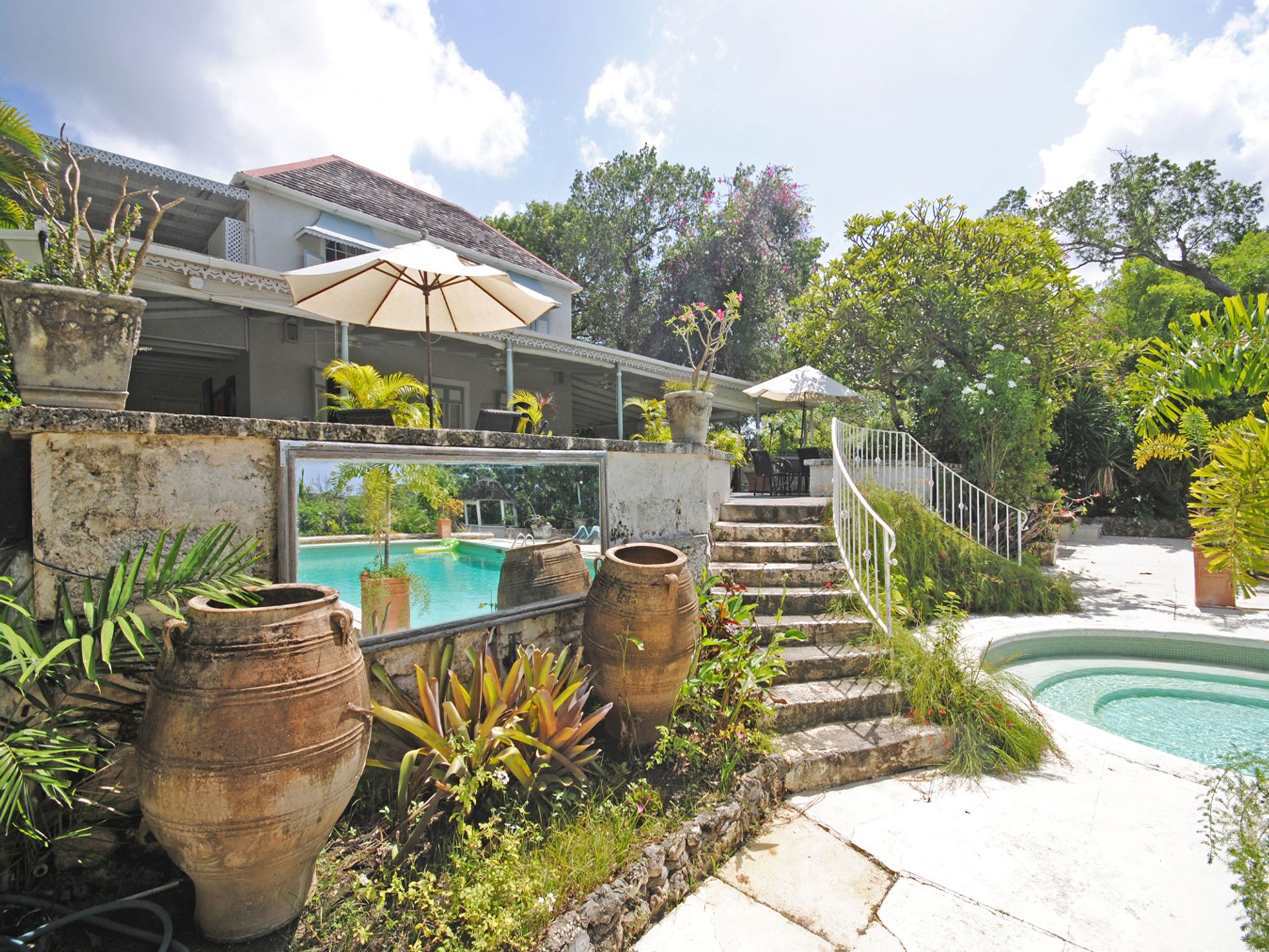 Holders House is set amongst five acres of formal gardens and lawns. The house is a 17th century plantation home surrounded by ancient Mahogany trees and features an aesthetically pleasing mix of traditional English and Barbadian architecture. Holders House is one of only a few plantation homes on the West Coast. It's layout takes advantage of the easterly tradewind breezes and there are beautiful views of the Holders Polo Field and the ocean beyond. The house has cool wrap-around verandas and a large swimming pool and terrace. A pool side gazebo can seat up to 12. There is another indoor dining area and comfortable sitting rooms. There are 5 ensuite bedrooms and a further 2 bedrooms that share a bathroom. All the rooms have air-conditioning and ceiling fans. This property has well landscaped gardens and is popular with holiday renters. Some of the furniture can be purchased by negotiation. In addition to the main house there are a number of cottages and outbuildings.